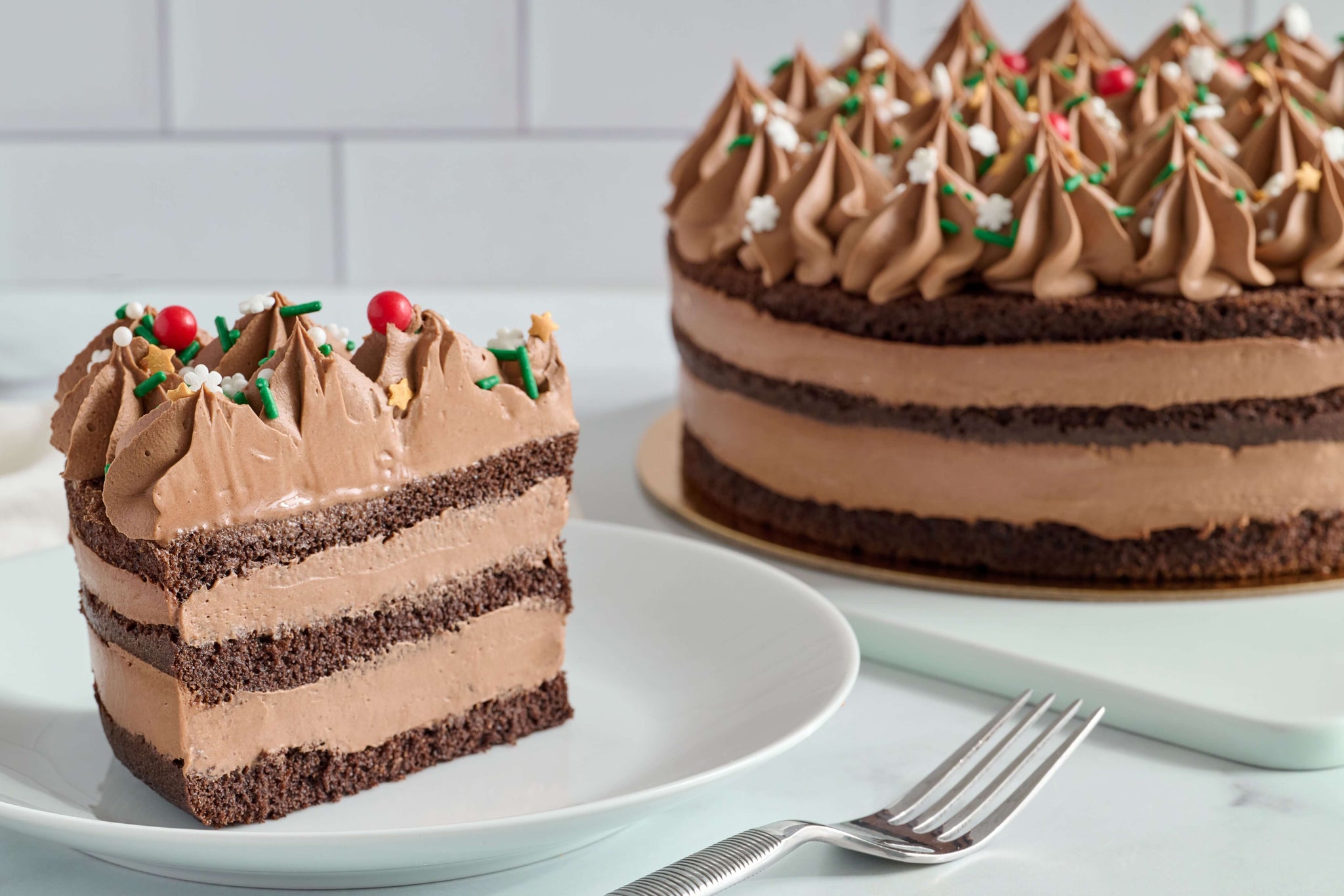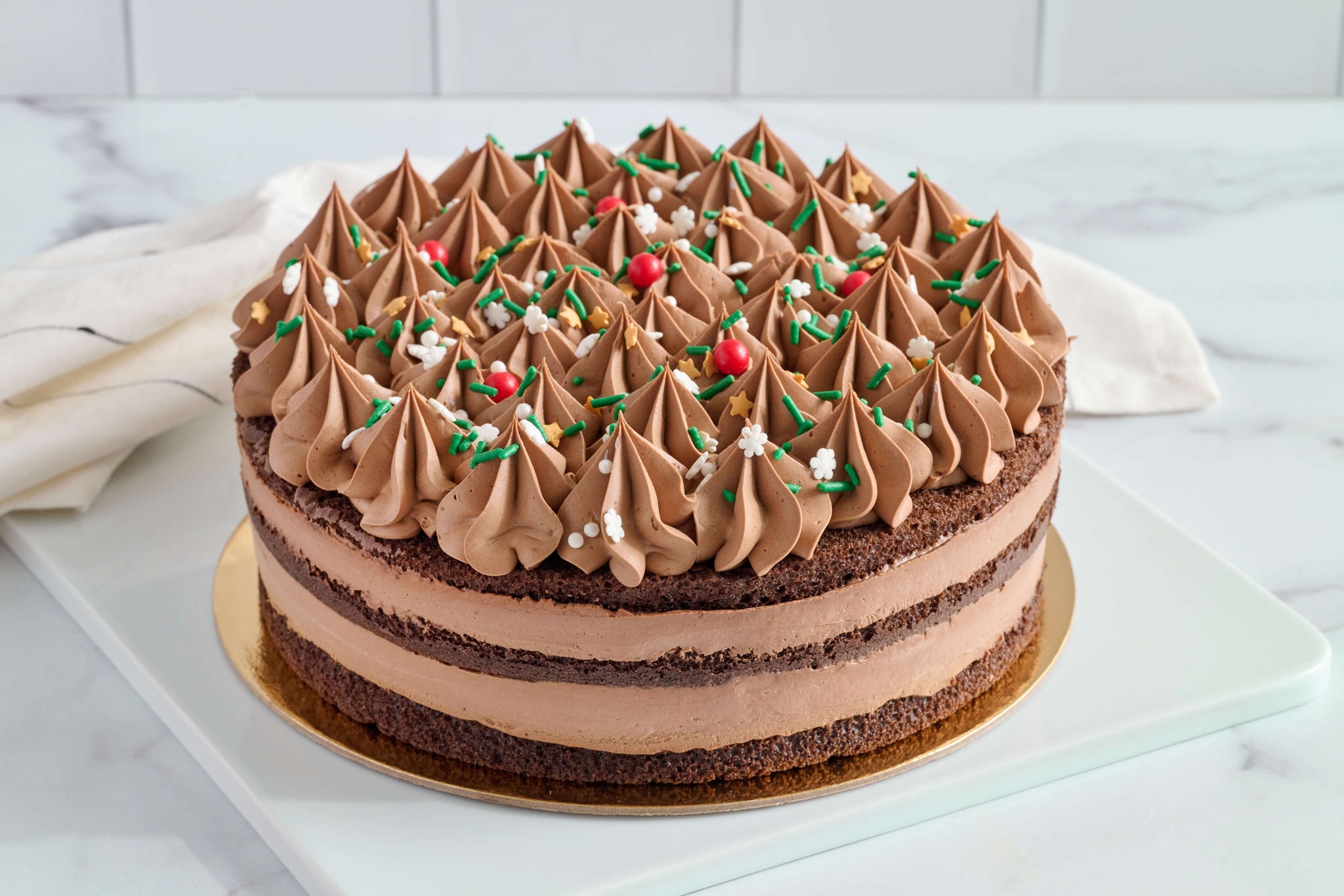 A guest favorite now with a festive holiday look. This is the same Parisian Chocolate Cake you know and love: moist chocolate cake layered with silky chocolate mousse and topped with Porto’s signature whipped chocolate ganache. For the holidays, we added a touch of festive sprinkles along with our classic white and dark chocolate crispy pearls. Serves 10 to 12.